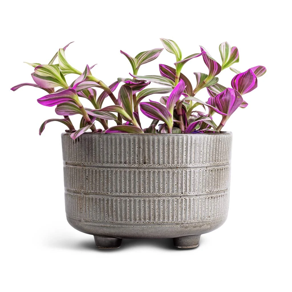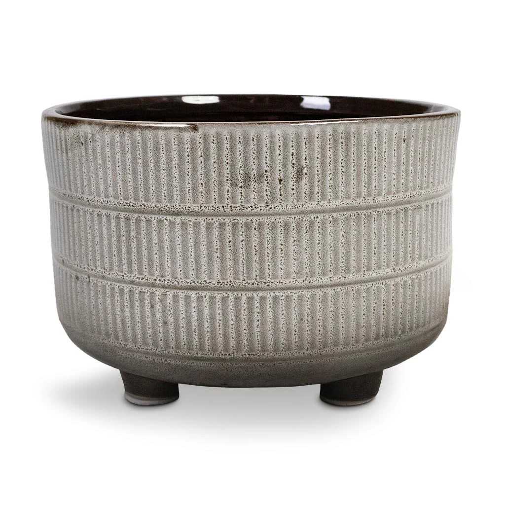 Art Deco meets rustic with the Denise plant bowl. Bands of vertical pebble-grey lines are highlighted by a neutral glossy glaze that fades into a base of burnt umber, surrounding a playful quartet of small feet to lift up your fashionable foliage.