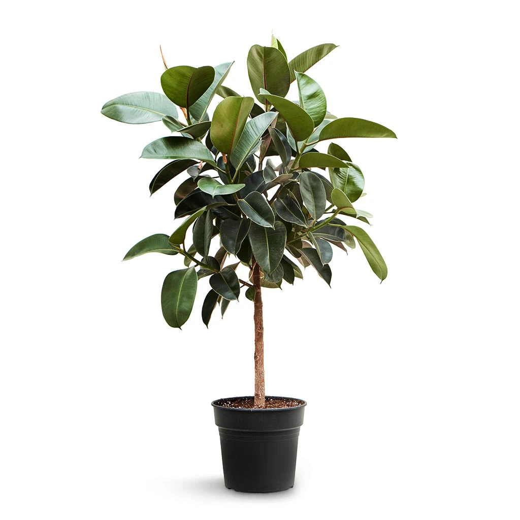 Owning a Rubber Plant is all about embracing the retro-chic elegance of its broad, glossy leaves. To heighten its charm, this straight-stemmed plant has been artfully sculpted into an elegantly shaped lollipop tree silhouette. Ficus elastica Robusta is a modern variety that closely resembles the original species in appearance, featuring leaves that are both wider and shinier.