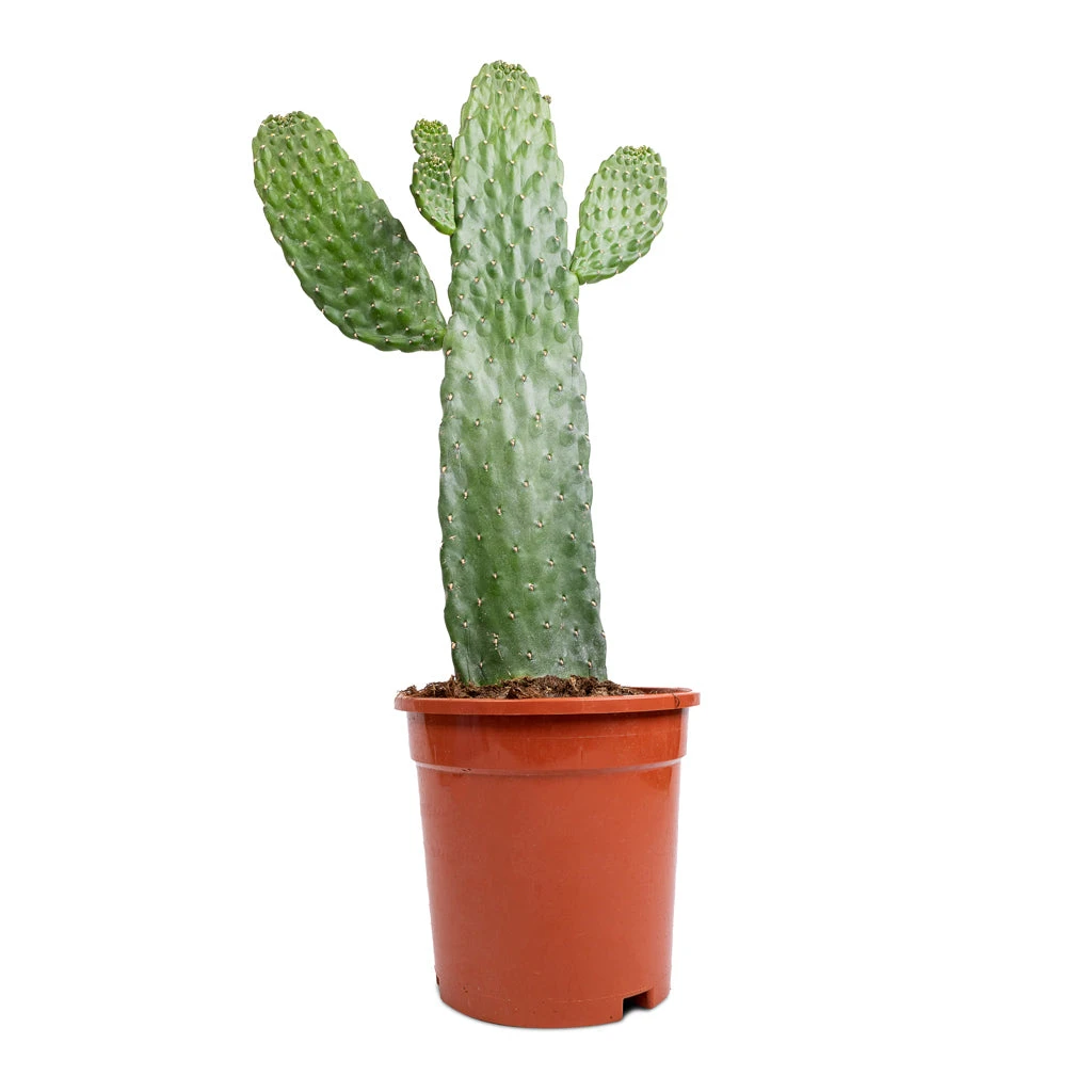 This cactus is known for its slow to moderate growth rate. It can eventually grow several metres tall, but typically will reach around 1 metre indoors. Remove the upper pads to maintain your desired height.